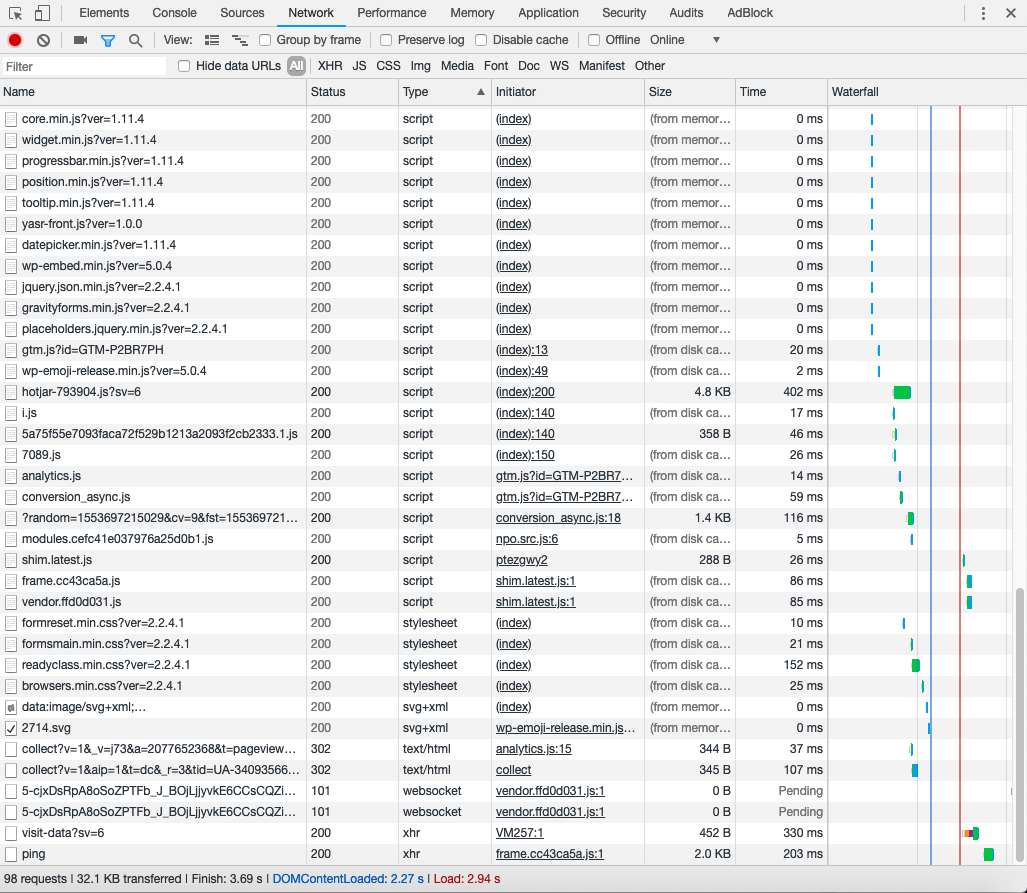 Once you sort the entries by which files/calls are taking the most time to load, you’ll start to see items like images, Javascript, and CSS files come up. This is normal, and this is what you’re going to focus on initially.