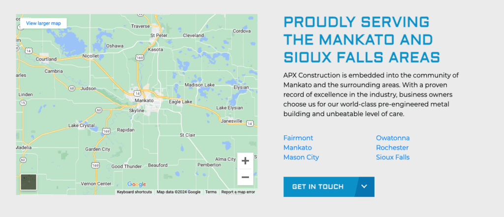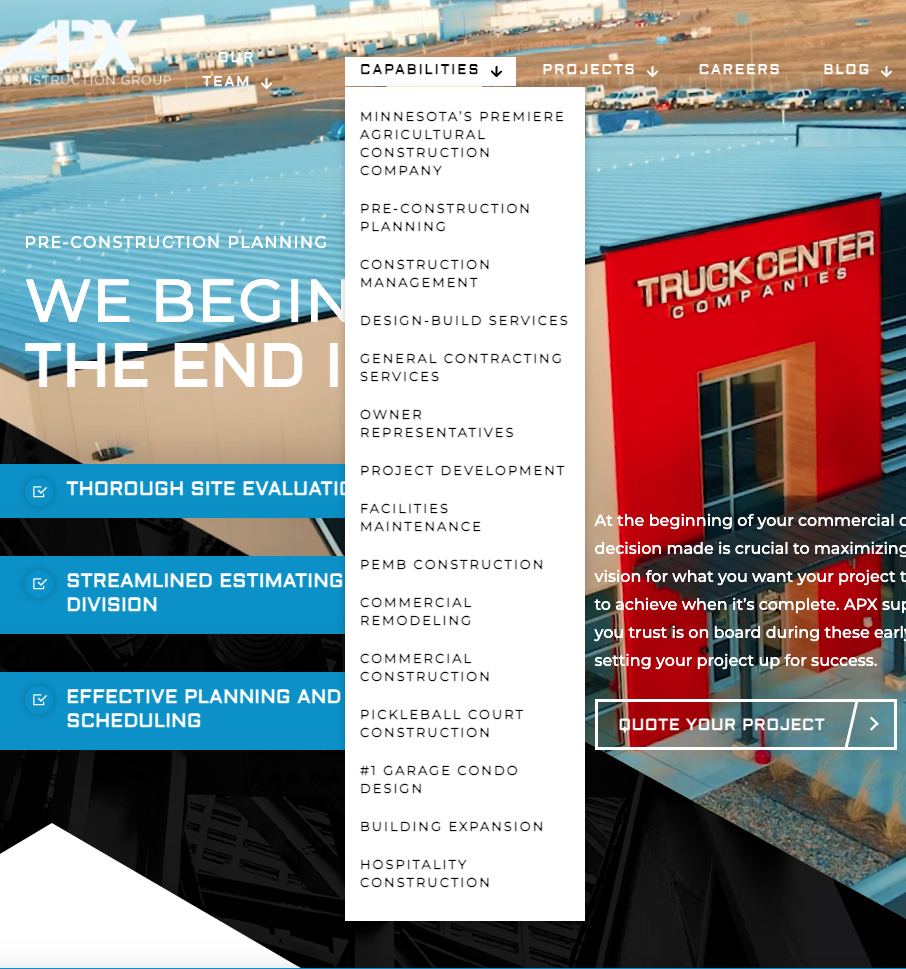 When I look at APX Construction Group, one thing I really like about their approach is that they created a number of service pages that speak to everything they offer. From agricultural construction to PEMB construction (Pre-Engineered Metal Buildings).