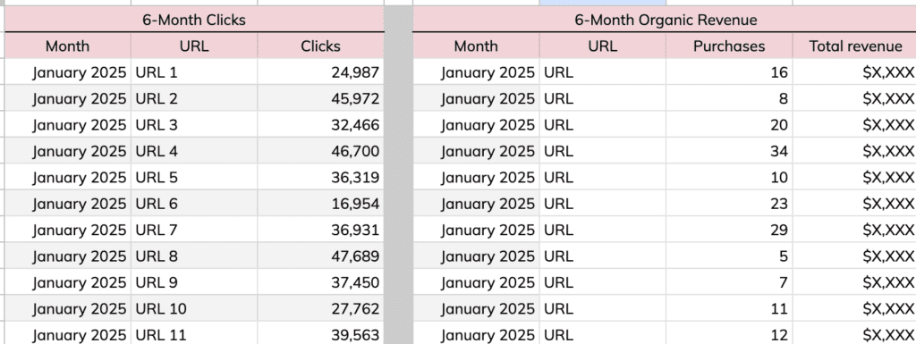Maps top 6-month clicks and revenue by URL to surface trends and seasonality. Makes it easier to plan ahead instead of reacting late. Interested in auditing seasonal paid data? Check out our guide here: Three Lessons Learned from Three Holiday Seasons with Performance Max.