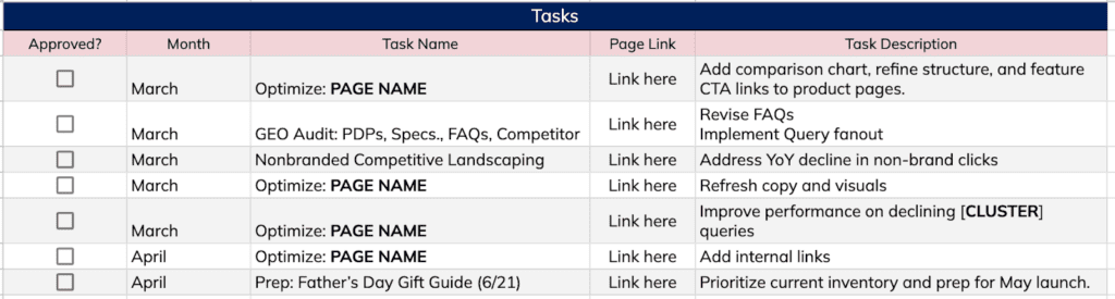 Covers core optimizations like page updates, GEO audits, internal linking, and seasonal prep work. Organized by month with quick links and short descriptions for easy scanning.