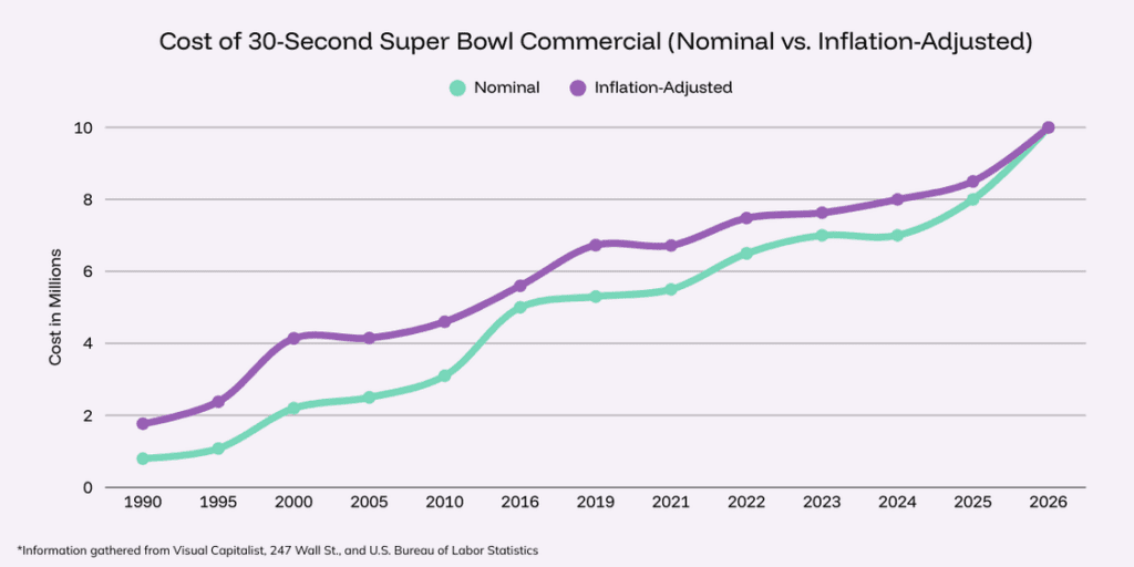 What’s changed is not just the sticker price, but the context behind it. When Super Bowl ad costs are adjusted for inflation, the upward curve still steepens over time. In constant dollars, the cost of a 30-second spot has continued to rise well beyond what general inflation would predict. The chart below shows that while inflation explains part of the increase, Super Bowl ad pricing has consistently outpaced it—turning the buy itself into a fixed cost of entry rather than a source of advantage.